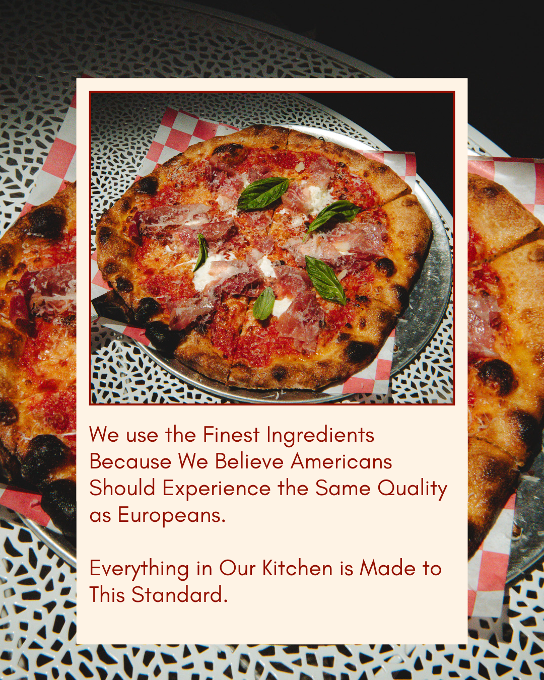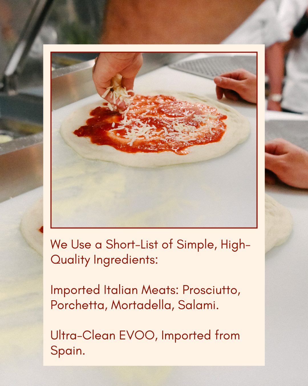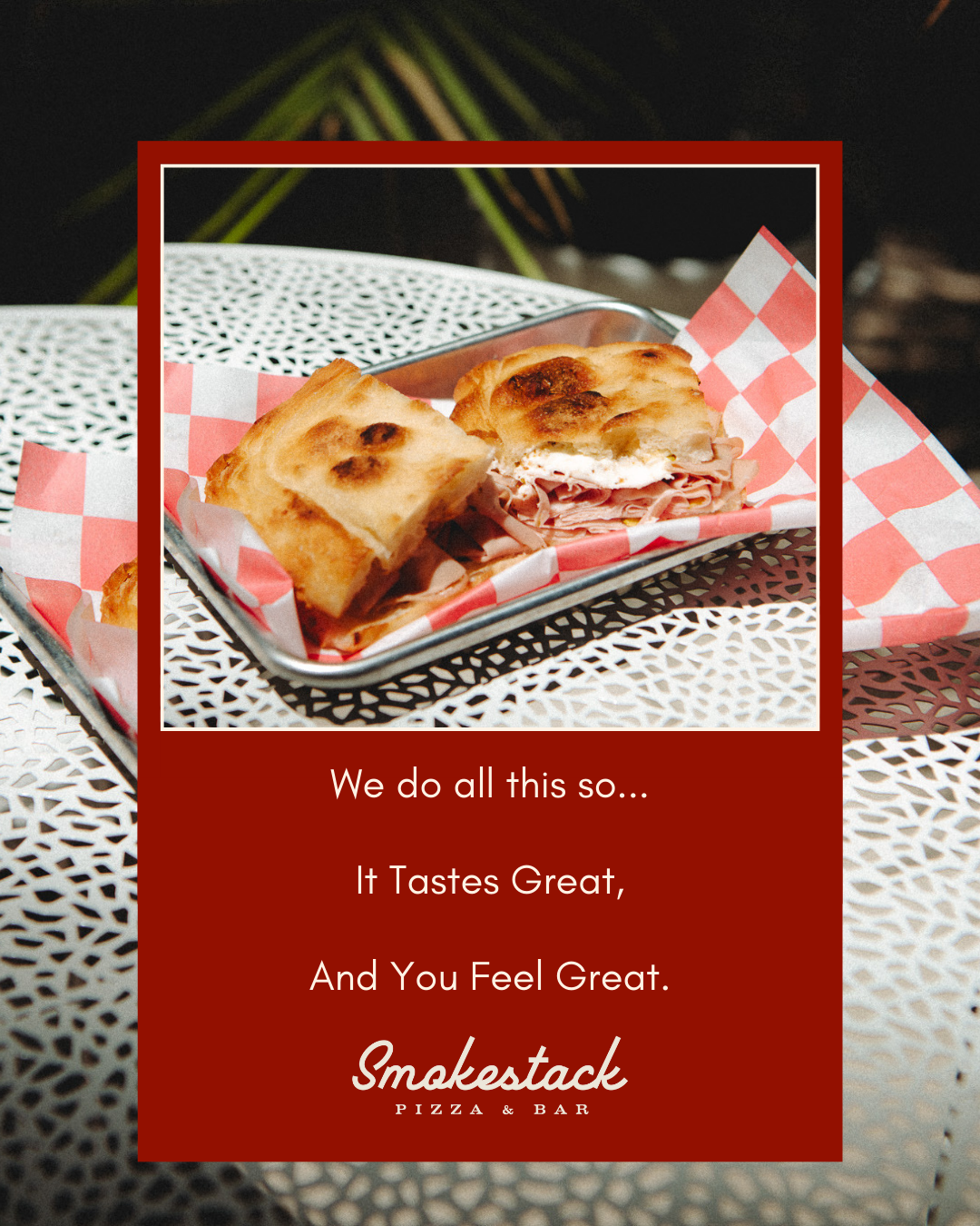 We serve 12" neo-Neapolitan style pies, 18" New York style pies, homemade focaccia sandwiches, and salads 7 days a week.